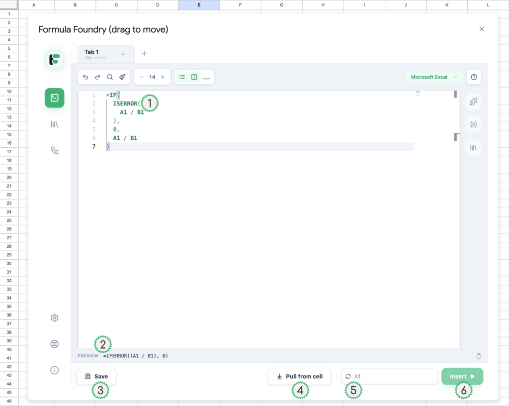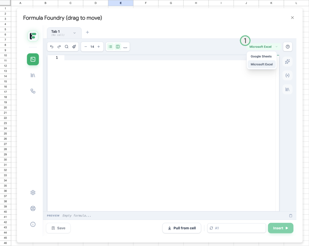 - Example of Formula Foundry automatically translating the Excel dialect into Google Sheets dialect