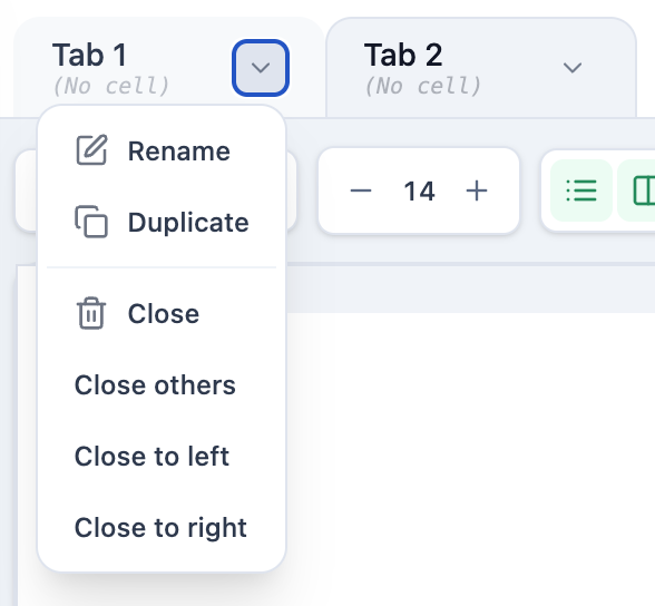 Tab sub-name (in gray below the bold tab name) is auto-set whenever “Insert” is used, so that users know the most recent place that tabs code was pushed into the Sheet- Addition tab controls are used by clicking the downward pointing carrot symbol within the tab: