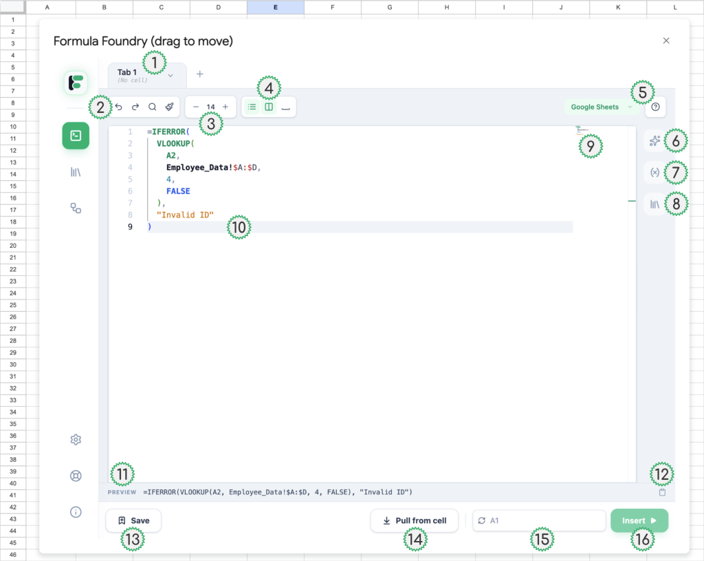 - Preview of code in Editor (what would be pushed into a cell when using the “Insert” button)