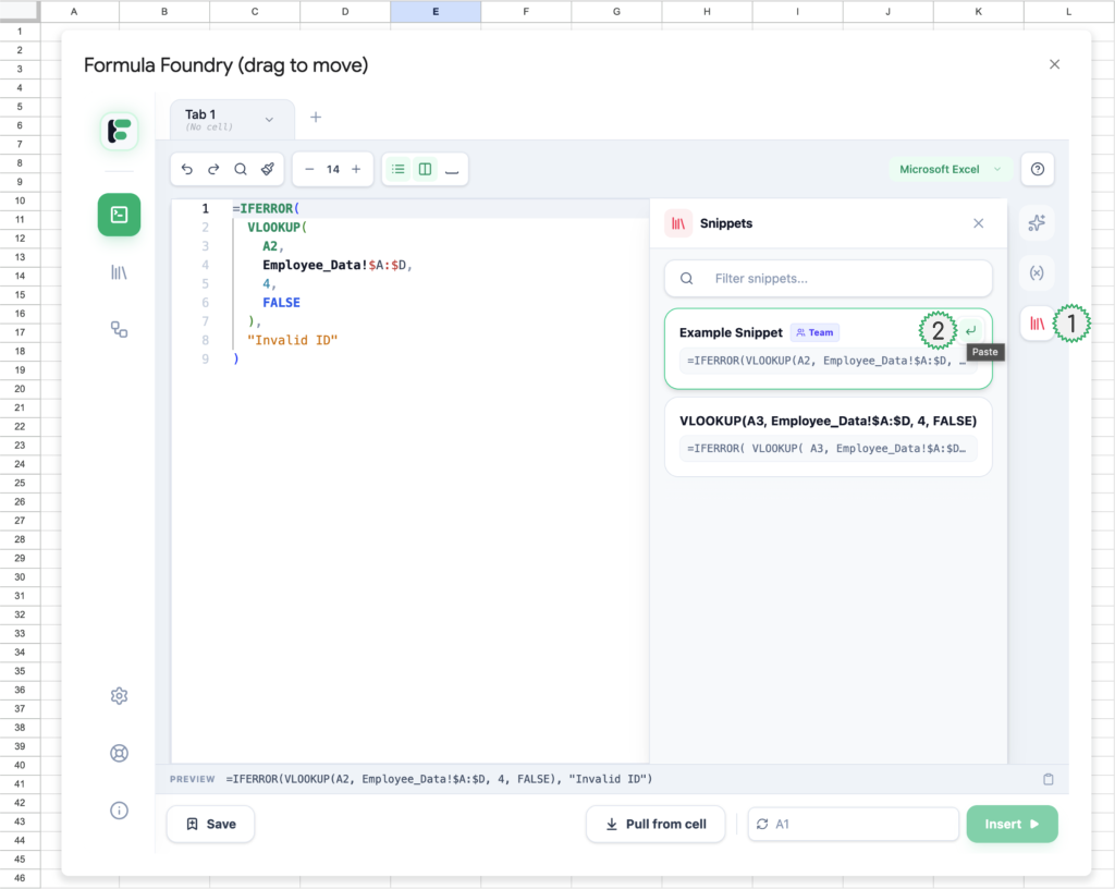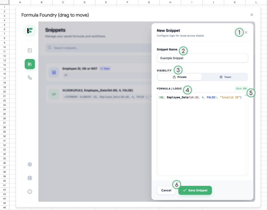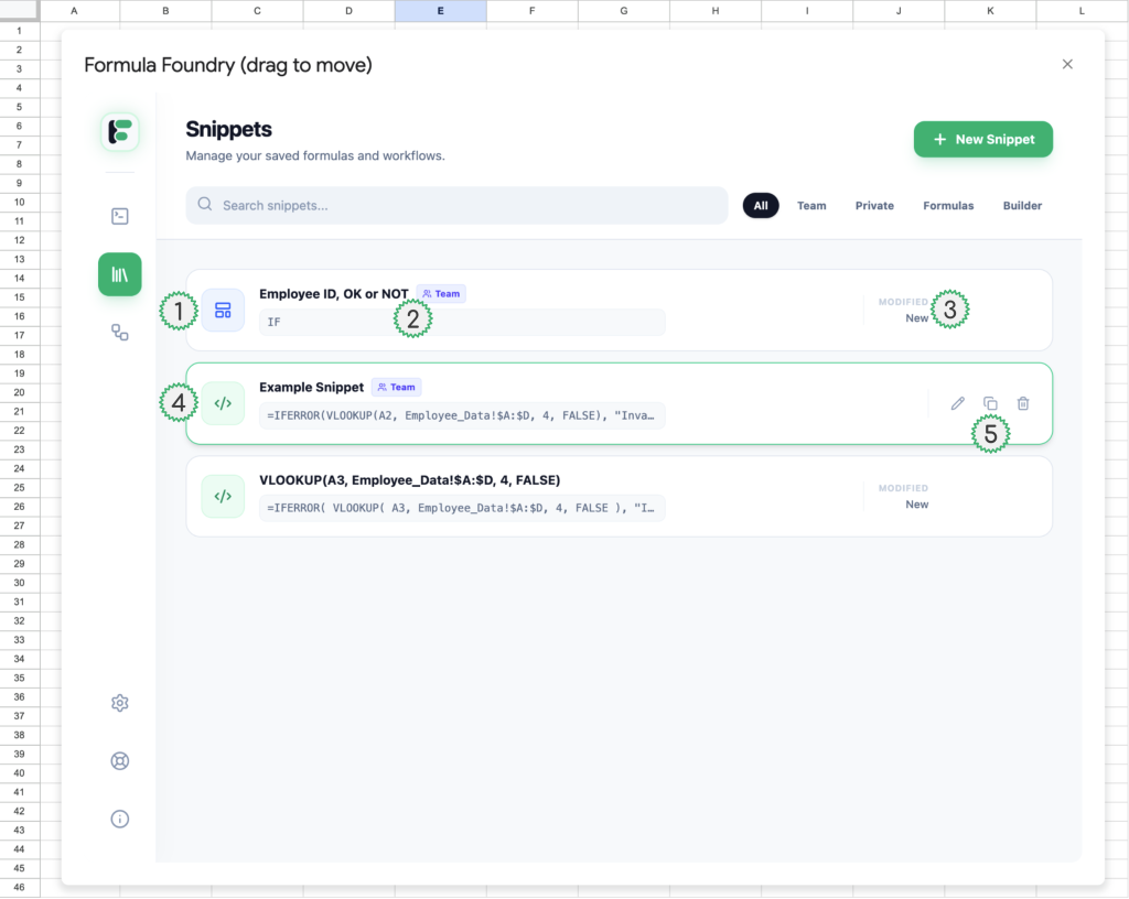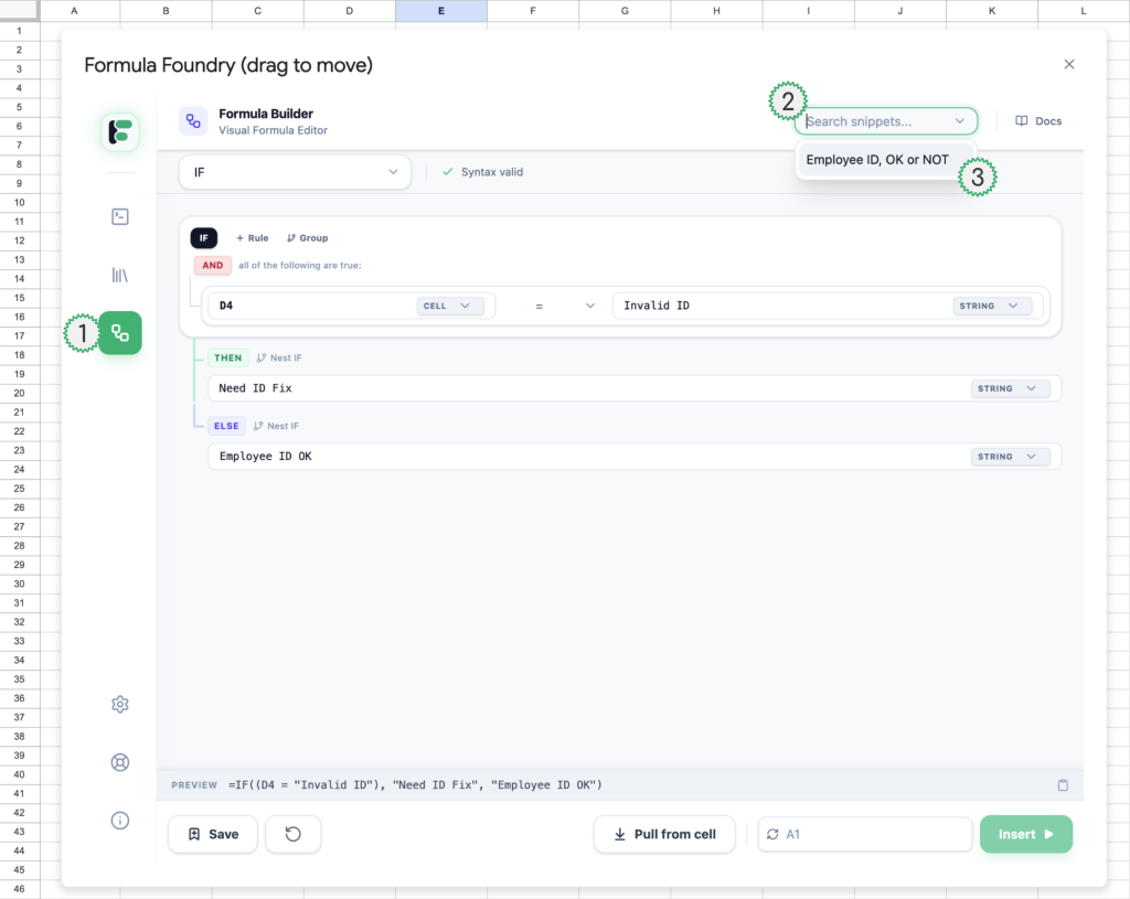 - Snippet preview (in the case of Snippets for use in the Visual Formula Builder, only the type of formula is shown – in this example it is an IF statement)